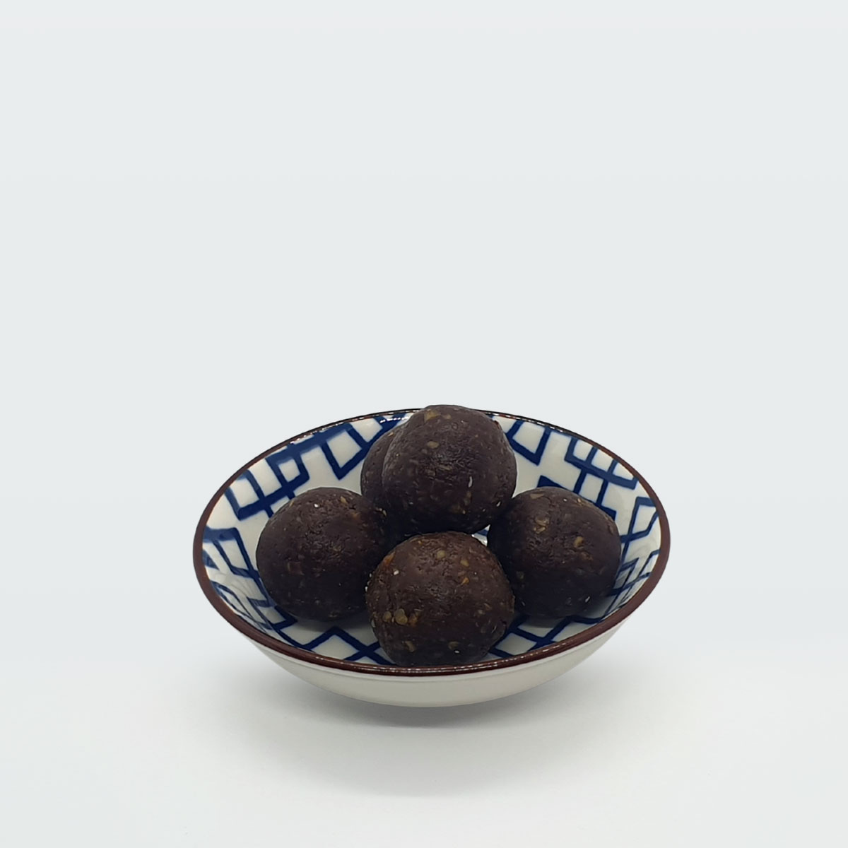 INGREDIENTS: raw oats, peanut butter, cacao powder, ground flaxseeds, honey, vanilla extract