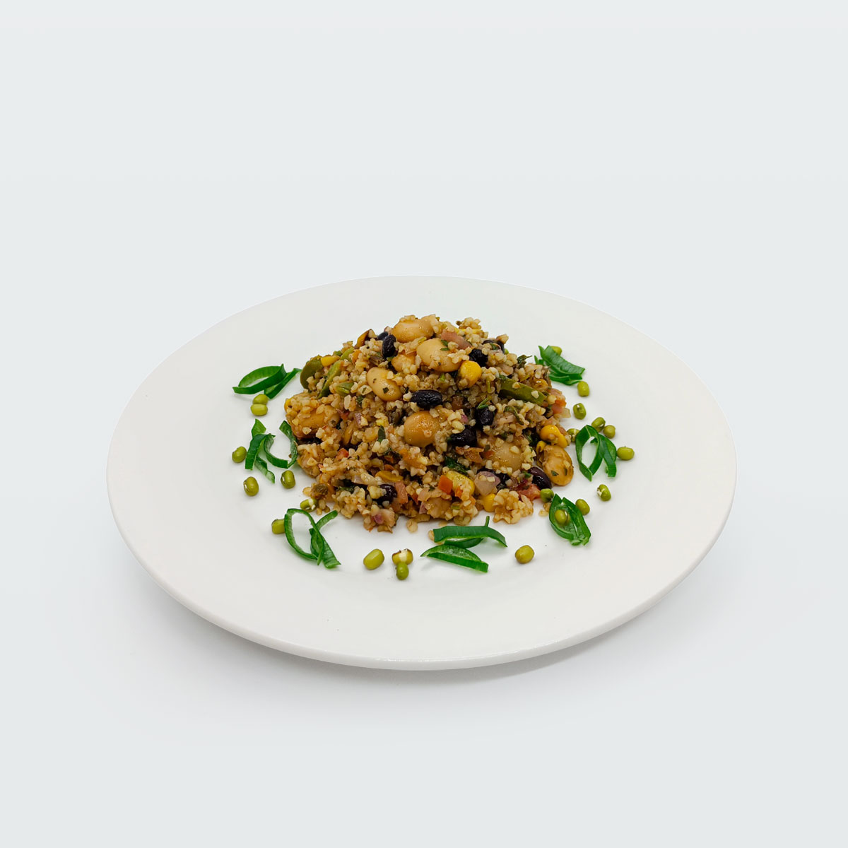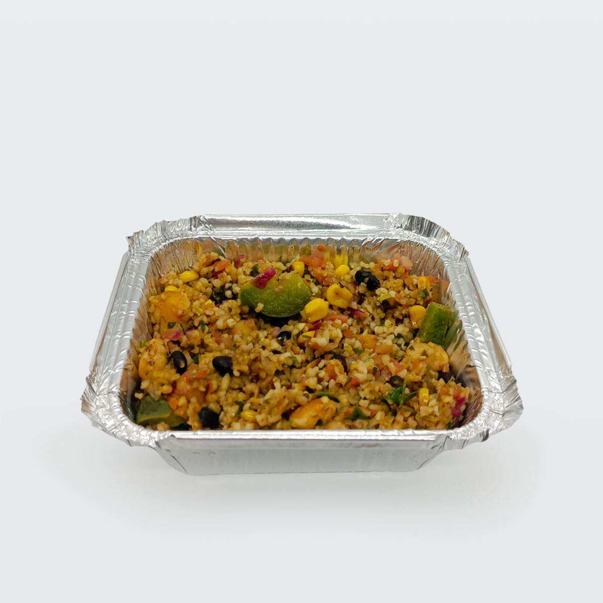 INGREDIENTS: bulgar wheat, variety of beans, onion, corn, green pepper, fresh herbs, GROUNDED salsa incl. jalepeno